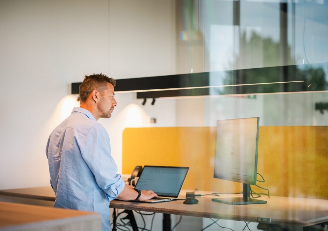Axel: Het is licht, open en gericht op hybride werken. Er zijn stille werkplekken, gezellige zithoeken en veel vergaderruimte. Het terras met zicht op de binnentuin is intussen een favoriete lunchplek. Het gebouw stimuleert verbinding en dat merk je. Ook extern maken we er graag gebruik van en zijn we trots om klanten hier te ontvangen. Het geeft ons de kans om te tonen wie we zijn.